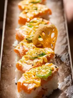 ✶ What It Is: Pressed sushi, often made with mackerel or shrimp, molded into firm, rectangular shapes using a wooden box, distinct from rolled sushi.