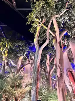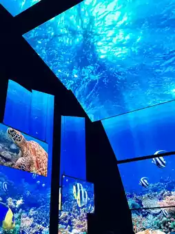 The pavilion opens with a simulated primeval forest, where dappled tree shadows and interwoven lighting create a sacred and tranquil atmosphere 🌳✨. Next, step into the immersive circular screen space, showcasing a 360-degree view of the Great Barrier Reef’s underwater wonders. Various marine creatures swim before your eyes, as if you are on a deep-sea adventure! 🐠🐢
