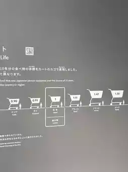 The exhibition centers on the “shopping cart” as a core image, symbolizing the volume of food consumed by people in different countries over 10 years. From Ethiopia (0.54) to China (1.92), behind the numbers lies a huge disparity in global food distribution and a reflection on environmental footprints. 📊