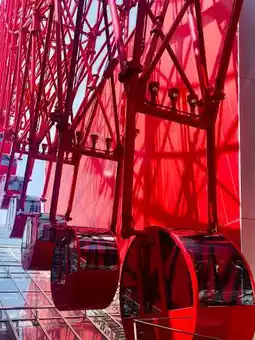 I looked up at the bright red wheel slowly turning above the rooftop.