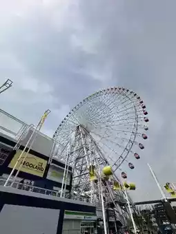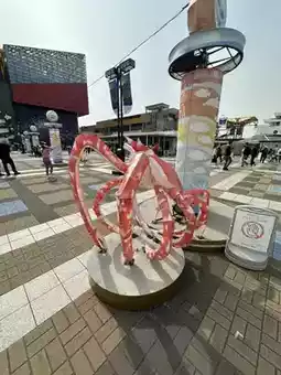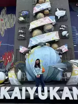 Just arriving at the entrance, you’ll want to grab your camera! The check-in spot in front of Kaiyukan Aquarium features a giant colorful glass wall patterned with fish that’s absolutely stunning. Next to it stands the towering Tempozan Ferris Wheel, a symbol that truly says, “You’ve arrived in Osaka” 🎡