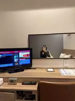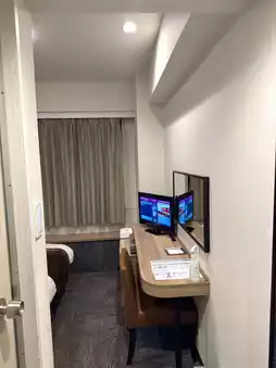 💗The room size is 13 square meters with 1 queen-size bed, which is quite small but typical for Japanese hotels. There is a table and chair for makeup or work, a TV, a refrigerator under the table, and a small seating area attached to the wall on the other side of the bed.