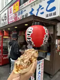Next, try the hot takoyaki—soft batter, packed with octopus, rich sauce, and a full aroma of katsuobushi. If you’ve never tried it, you must! Walk a little further to find kushikatsu, deep-fried skewers that are crispy on the outside and tender inside. Dip them in rich sauce and enjoy.