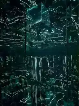 The exterior is a cubic structure (a cluster of voxels) made of mirrored membranes. The mirror surface deforms in response to wind and sound, organically reflecting visitors and the surrounding scenery.