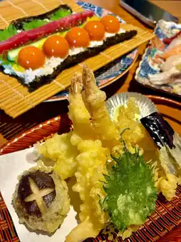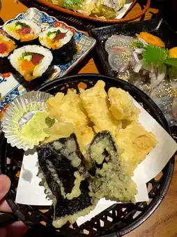 The tempura platter features large prawns fried to a golden crisp, and the vegetables are juicy. They were gone in just a few bites, so we ordered an extra plate of corn tempura, which was incredibly sweet. The sushi with small pieces of raw egg yolk and seafood is so exquisite, both fragrant and refreshing—it’s the taste of happiness.