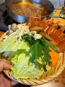 The sweet shrimp shabu-shabu hot pot is very generous in portion and served in a Japanese style. The prawns paired with cabbage become more delicious the longer they cook, and the broth with udon noodles is amazing. Two girls finished the entire pot and drank all the soup.