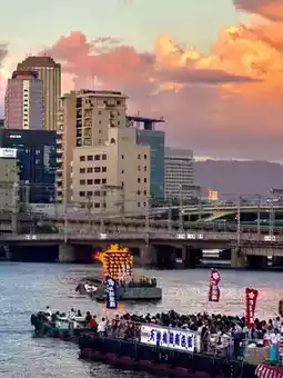 I originally went to the Tenjin Festival for the fireworks show, but when I got there, it felt like the fireworks only made up about one-third of the festival. Many people just come for the lively atmosphere, to buy snacks, and stroll around the streets. The fireworks only serve as a festive highlight and aren’t really something special to photograph. However, on the way to the fireworks show, I was lucky to capture a beautiful city sunset at Tenmabashi, so the trip was still worthwhile.