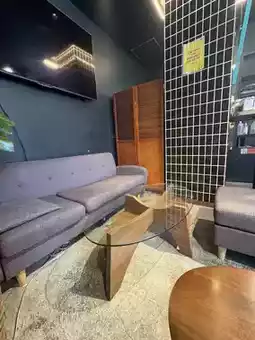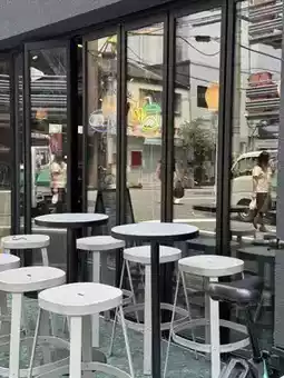 The shop is located on the first floor of a hostel, offering various seating styles including counter, sofa seats, and terrace seats.