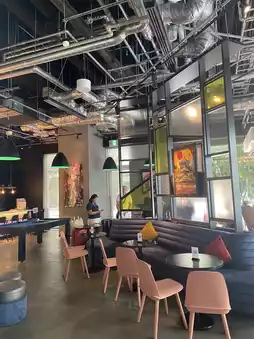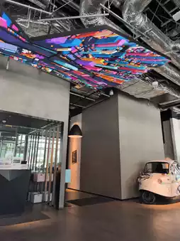 The exterior is stylish, and inside the hotel, neon × art × music create a playful atmosphere.
