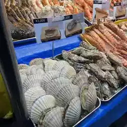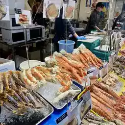 Inside the market, shops line the streets offering fresh sushi, seafood skewers, fruit sweets, and more that you can enjoy while walking around, making it a feast for all your senses!
