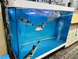 Kuromon Market is also a key place for Osaka’s fugu (pufferfish) cuisine. We saw many fugu-related elements throughout the market. At one restaurant entrance, two cute fugu specimens wore little hats labeled "Landing," looking amusing. At another shop, we spotted lively fugu swimming in a tank, their round bodies adorably charming. This gave us a more direct understanding of Osaka’s fugu culture.