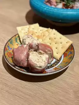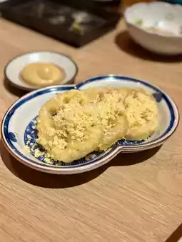 The chicken skin finished with sweet ponzu is perfectly balanced with savory and tangy flavors. The sukiyaki croquette has an addictive sweet and savory meat and potato flavor. The bone-in tulip fried chicken is juicy and very satisfying. The fig and cheese canapé pairs well with wine. The mustard lotus root has a spicy kick that stimulates the appetite, making these perfect drinking snacks.