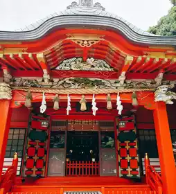 Takatsu Shrine features a unique style and profound historical heritage. The vermilion torii gate appears especially vibrant under the sunlight.