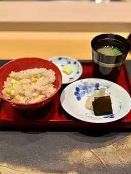 The corn-cooked rice was fragrant with truffle butter, making for a satisfying course from start to finish. The peach ice cream was full of fruity flavor and had a delicious aftertaste.
