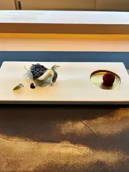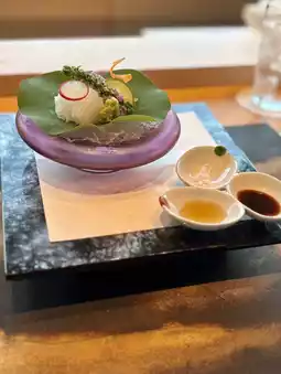 The appetizer is impressive with its tart plum and fragrant sweetfish, while the edamame tofu and conger eel soup is refreshingly summery. The grilled sea bass has an exquisite blend of the sweetness of the onion miso and the tartness of the mountain peach, while the potato and octopus nankin has a gentle flavor. The melting umami of the seared Japanese black beef is a perfect match with the refreshing coolness of the Kamo eggplant.