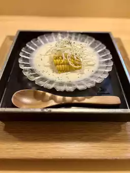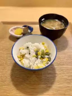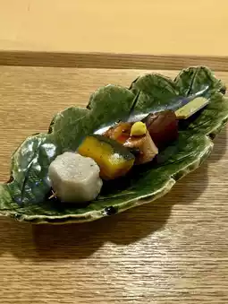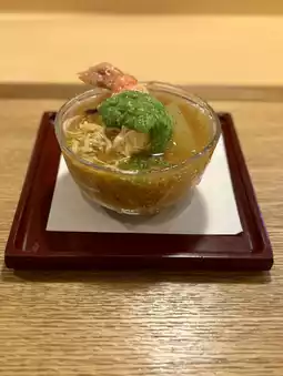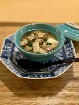 The salt-grilled sea bass is refreshing with the combination of grated water chestnut vinegar and salmon roe, while the somen noodles in nameko broth are a refreshing dish. The chawanmushi with sweet bean paste and matsutake mushrooms is fragrant, and the potato and octopus skewers have a warm and comforting taste.