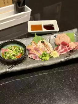 The Amazing Appetizer Platter features seven colorful small side dishes, perfect as snacks with sake. The local chicken sashimi platter is incredibly fresh, highlighting the texture and flavor of each cut. The charcoal-grilled local chicken is fragrant and juicy, and the meatballs, mixed with egg yolk, have a rich flavor. The specialty rolled omelet is fluffy and creamy, and the homemade chicken nanban tartar sauce has an exquisite balance of sweet and sour flavor and tartar sauce.