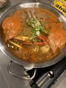 Next, enjoy the Blue Crab Stew. The soup, simmered to perfection, is infused with crab essence. Dip the noodles into the broth, and they soak up the flavors, served piping hot.