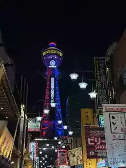 ✨ A retro street filled with nostalgic vibes! With vintage signs, the Tsutenkaku Tower, and Osaka’s famous kushikatsu skewers, it’s a must-visit.