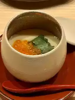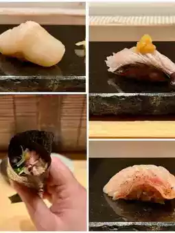 Beginning with a tasting comparison of bluefin tuna, otoro, and akami-zuke, the course continued with a series of exquisitely aged and seasoned nigiri sushi, including three-day-aged striped horse mackerel, sweet shrimp and kelp-cured splendor, golden-eyed snapper, kinki, snow crab, scallops, Spanish mackerel, fatty taku herb-wrapped taku, and eel hand roll. The spoonfuls of salmon roe and sea urchin were also sumptuous, with a lingering aftertaste.