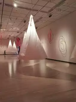 A stunning spatial experience: Six large installations intertwined with red threads create a immersive experience that allows you to experience the senses of absence and connection.
