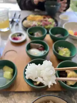 • Japanese-style set: A clean and balanced meal featuring rice, miso soup, grilled fish, rolled omelet, and pickled side dishes.