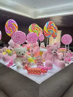 The lobby is decorated with an adorable pink teddy bear photo wall🧸