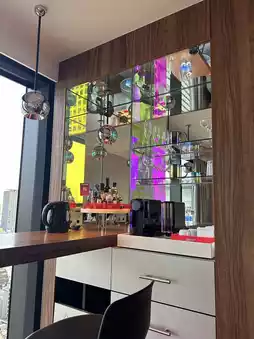 The interior is vibrant and playful, evoking the image of the "neon city of Osaka."