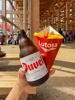 In front of the pavilion, you can casually enjoy a Belgian experience with crispy French fries, Belgian waffles, and a bottle of beer.