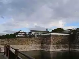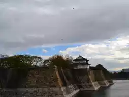 The main keep of Osaka Castle stands majestically and solemnly atop towering, steep stone walls, surrounded by a deep moat that highlights the fortress's resilience and historical grandeur.