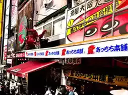Restaurants offering Osaka specialties like takoyaki and okonomiyaki line the streets.