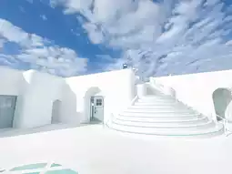 This location serves as both a hotel and a café that non-guests can also enjoy. Surrounded by white buildings, descending the stairs reveals a breathtaking ocean view 🏖️—a perfect spot for photos 📷.