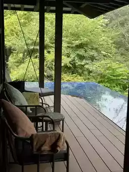 The lounge offers unlimited drinks and snacks. Private hot springs and the heated pool are free to use, while the sauna is available for an additional fee.