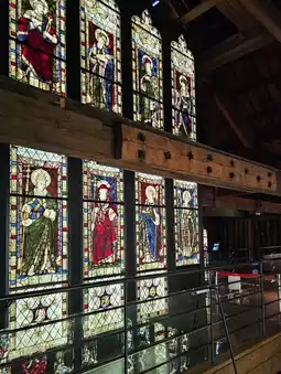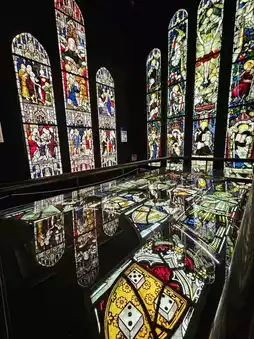 The images and letters depicted in the stained glass condense the history of Britain, from the glorious era under Queen Victoria to the Edwardian era and on to World War I.
