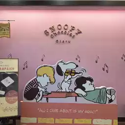 There are Snoopy dolls, stationery, and fashion items, as well as Snoopy drinks, Snoopy Choco-an, and other food.