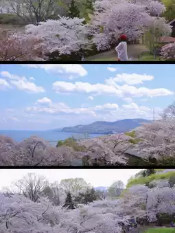 This spot is a triple treat: cherry blossoms with the ocean and snowy mountains in the background—an unbeatable combination! ❄️🌊🌸 The sloped paths around the park also open up more interesting photo angles 📸