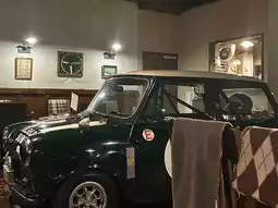 The interior is filled with warm lighting and a relaxing atmosphere, and the impressive interior, featuring cars and motorcycles on display, is truly beautiful.