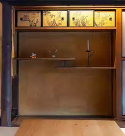 The room preserves period charm through decorative alcoves, built-in cabinets, cocoon-shaped lamps, and silk scrolls showcasing Ozu's textile heritage - all blending historical authenticity with breathtaking design.