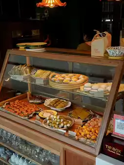 🌾The main menu will be a variety of Thai desserts that are not often seen. They may have been vaguely in my childhood memories, but are now almost impossible to find, such as the local Lanna dessert menu, such as "Khanom Wong", a northern dessert that looks like a mini donut with crispy dough and sugar, and "Khanom Kluea", a white sheet wrapped in banana leaves. Salty and sweet, “Khanom Ling Ma” mixed with coconut has a chewy texture, or coconut sugar cup cake, rice cracker juice, Khanom Jok, banana porridge cake, Hong Kong egg cake, stuffed cake, banana cake, Thai melon cake, Matum jelly, Singaporean Lod Chong, or daily special dessert menu.