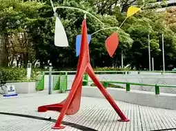 A wide lawn and installation art pieces wishing for peace