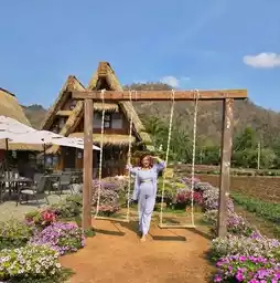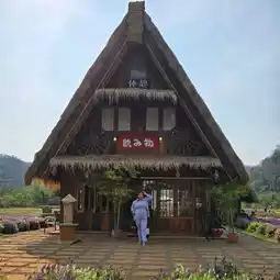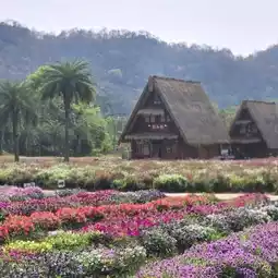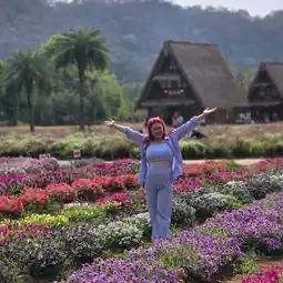 Hokkaido Flower Park Khaoyai is a Japanese-style flower garden that imitates a triangular house (Gassho) in Shirakawago, a red torii gate, and the character "Totoro" from the movie My Neighbor Totoro, which is surrounded by a large garden of colorful flowers with a beautiful mountain view. There are many photo spots, along with yukata sets for rent to take beautiful photos. There is also a Japanese-style cafe with drinks, daifuku, other bakery goods, and souvenirs from the garden, including fruits, grape juice, and many more. However, it is recommended to come in the morning when the weather is cool and comfortable, there are not many people, and it is not sunny. In the late morning, the sun will be hot and there will be tour groups, so it may be a bit crowded. It is recommended to bring an umbrella. The garden is located in Tambon Mu Si, Pak Chong District, Nakhon Ratchasima Province, near Khao Yai National Park. Open daily: 7:30 a.m. - 6:00 p.m. Children's admission fee is 50 baht, adults 120 baht. (You can use the admission ticket to get a discount on food and drinks.)