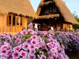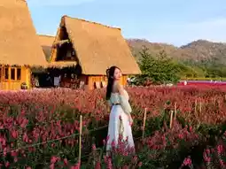 🇯🇵 🌺 Hokkaido Flower Park Khao Yai is a flower garden with a Japanese-style house café, located near the entrance to Khao Yai National Park. It is a place to enjoy a variety of flowers in many colors, with a backdrop of mountain views. The park offers yukata rentals for photoshoots within the garden and has a café serving snacks and drinks.