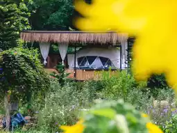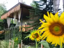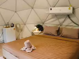 🏕️The accommodation is a large dome tent that is raised high, allowing a view of the vegetable and flower gardens. The interior is air-conditioned and has complete facilities, with a private bathroom. There is a balcony for sitting or working amidst nature.