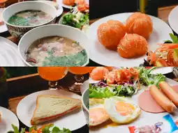 🍱Breakfast is served in the tent. It's a set meal with rice porridge, toast, sausage and fried egg set, fruit, served in a large set.