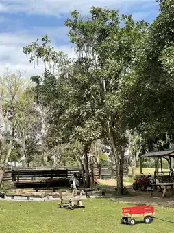 The surrounding area is spacious, with a golf course, a lake, a horse farm, and a cafe in the middle of a field.