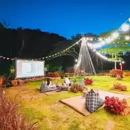 and watching an outdoor movie on the green lawn surrounded by nature.