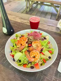 An organic salad restaurant with a great atmosphere in Khao Yai, where it feels like dining in a vegetable garden. They offer a variety of salad greens, cold-pressed vegetable and fruit juices, and delicious salad dressings. Additionally, there are other healthy menu options as well as general dishes like sour curry with cha-om, fried shrimp, single-plate meals, spaghetti, and mashed potatoes. The restaurant provides a wide selection of dishes and features photo spots with vegetable arches and tomatoes 🍅, giving off a natural farmhouse vibe that's refreshing.