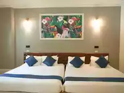 There are many types of rooms to choose from. Today, we chose to stay in a FAMILY SUITE room. It has pool access, so you can open the door and play in the pool. The room is very spacious, with 2 bedrooms, 3 bathrooms, and a living room for dining.