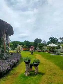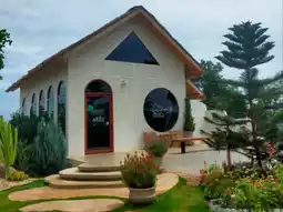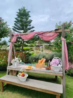 A flower garden and cafe on a high hill, surrounded by nature and forests, beautiful views of 360 degrees