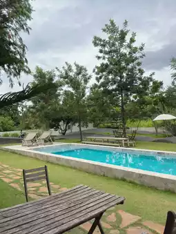 Oria Cafe Khao Yai is a spacious cafe with cute photo spots everywhere. The clothes drying rack is a highlight. It's so lovely and upbeat. July is perfect weather, with lush green grass, not too hot, and not too sunny.